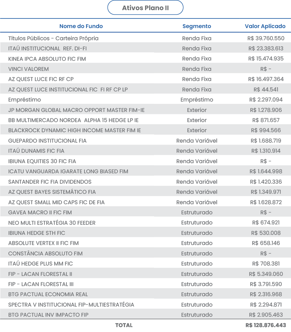 No Plano II, o desempenho também foi excelente, com destaque para os segmentos de renda fixa, operações com participantes, investimentos no exterior e renda variável, que superaram a meta para o mês e no acumulado do ano. O segmento estruturado, por sua vez, registrou rentabilidade positiva em agosto, embora abaixo da meta mensal, mas se mantevem positivo e acima da meta atuarial no acumulado de 2025. O INPC de agosto também ficou em -0,21%, fazendo com que a meta atuarial atingisse 0,13%. O resultado do mês foi superavitário em R$ 50,7 mil e o plano agora acumula um superávit total de R$ 1,26 milhão.