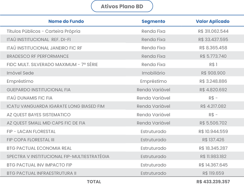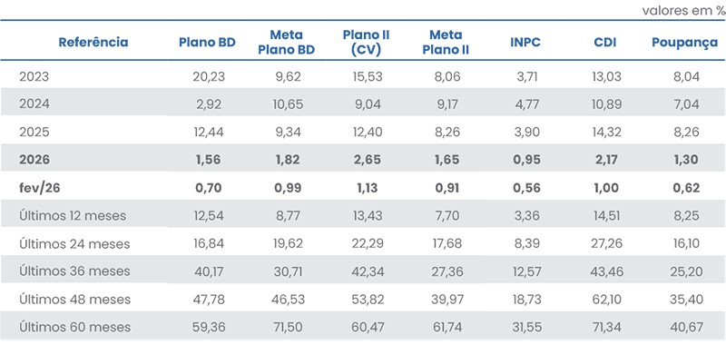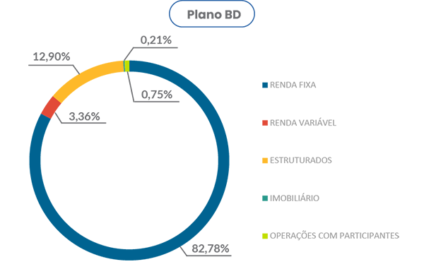 O Plano de Benefício Definido (BD) obteve rentabilidade líquida de 0,70%, situando-se abaixo da meta atuarial de 0,99%. Em sua carteira, os segmentos de Renda Fixa e Operações com Participantes registraram retornos positivos, porém inferiores à meta. Em contrapartida, os segmentos de Renda Variável e Imobiliário performaram acima da meta atuarial, tanto no mês quanto no acumulado do ano. Já o segmento Estruturado apresentou rentabilidade negativa em ambos os períodos. Diante desse cenário, o plano registrou um déficit mensal de R$ 328 mil, mantendo — contudo — um superávit acumulado de R$ 29,45 milhões.