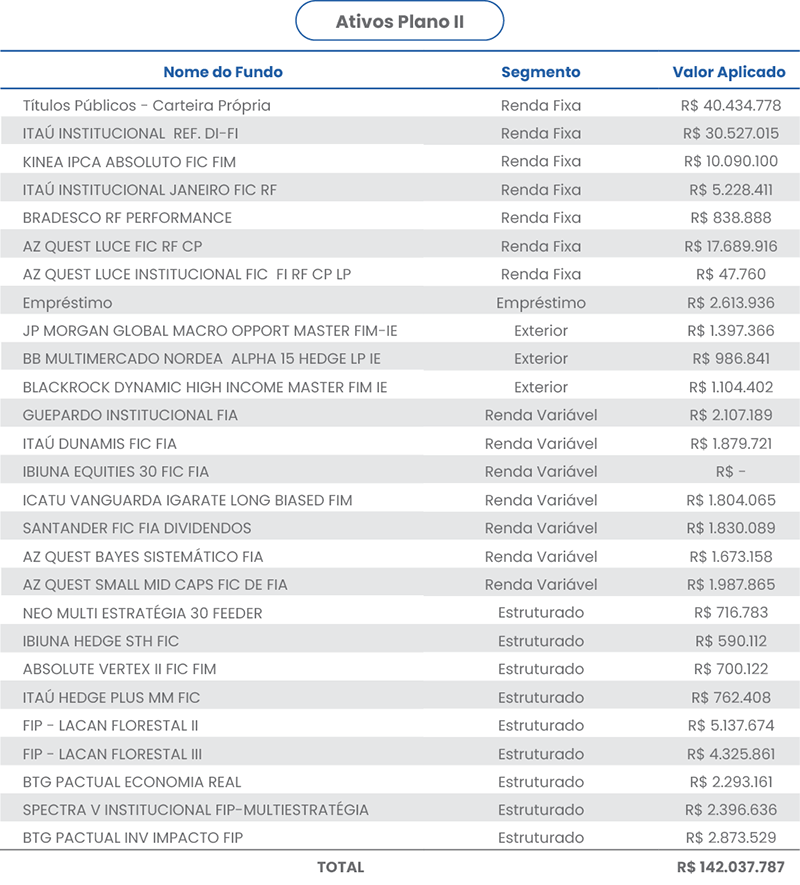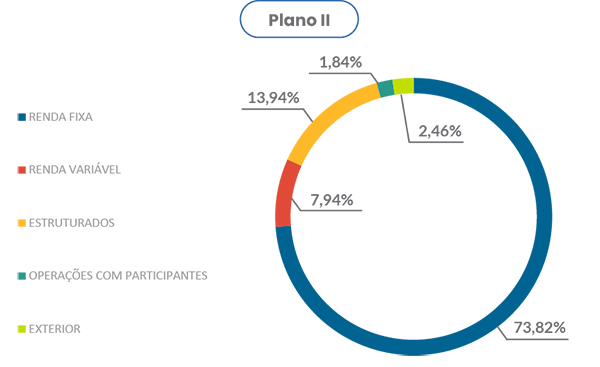 O Plano de Benefícios II alcançou uma rentabilidade líquida de 1,13%, superando a meta atuarial de 0,91%. Os segmentos de Renda Fixa e Renda Variável destacaram-se com retornos positivos acima da meta mensal. No segmento de Investimentos no Exterior, a rentabilidade foi positiva, embora abaixo da meta no mês; no acumulado do ano, todavia, o resultado permanece positivo e acima do objetivo. O segmento Estruturado, por sua vez, superou a meta no mês, mas segue abaixo dela no acumulado do ano. Com o resultado operacional favorecido pela performance dos investimentos, o Plano II registrou superávit de R$ 31,5 mil no mês, consolidando um resultado acumulado positivo de R$ 1,72 milhão.